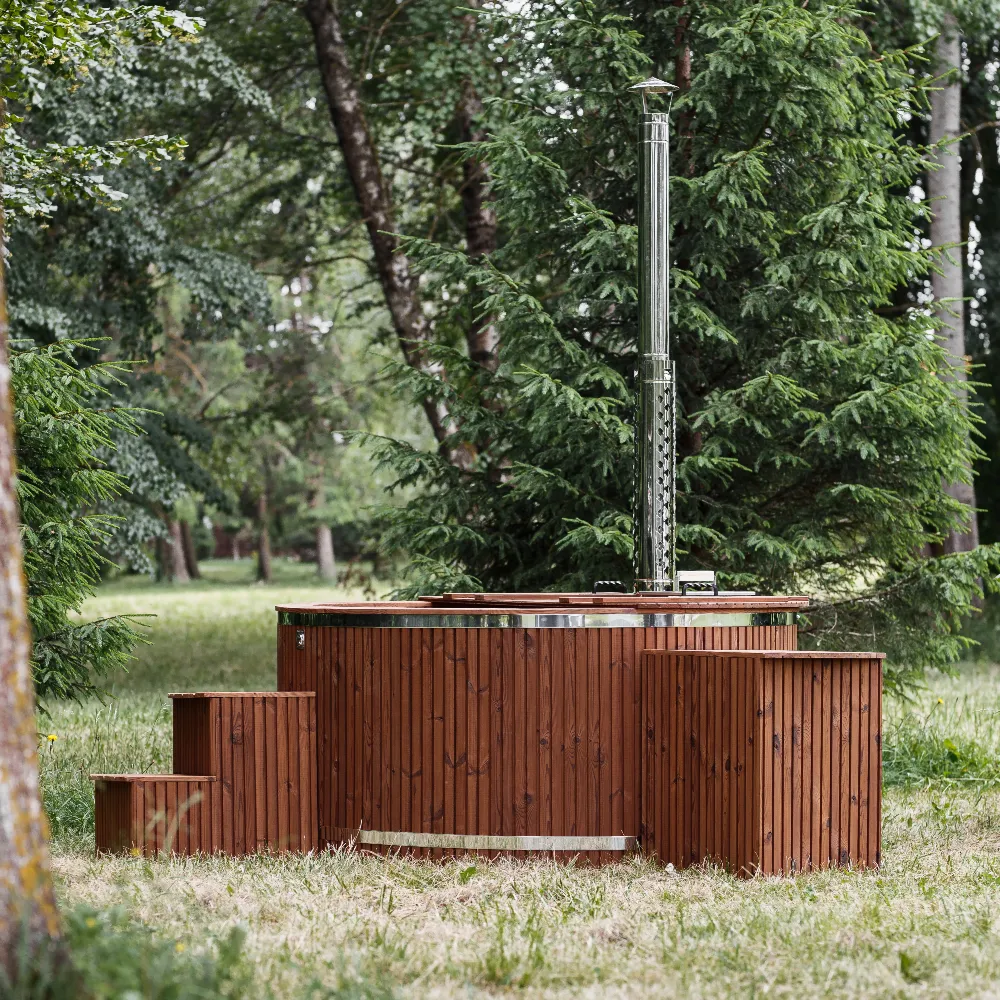 A wood-fired hot tub offers a traditional, eco-friendly, and cost-effective outdoor spa experience. Unlike electric models, this hot tub utilizes natural firewood for heating, creating a rustic and authentic relaxation environment.